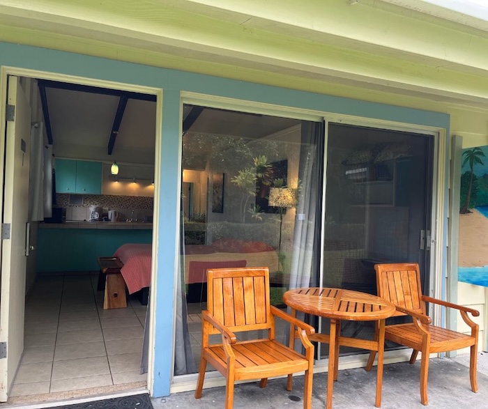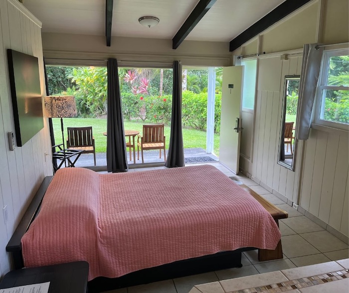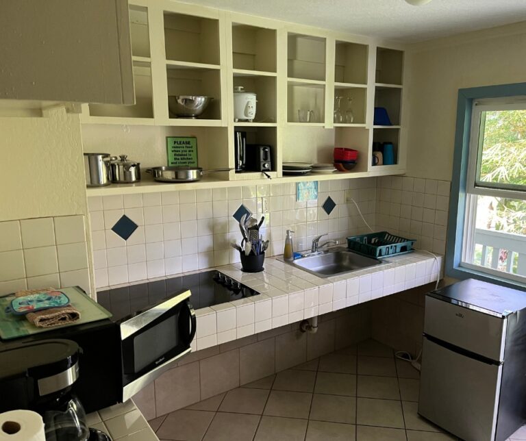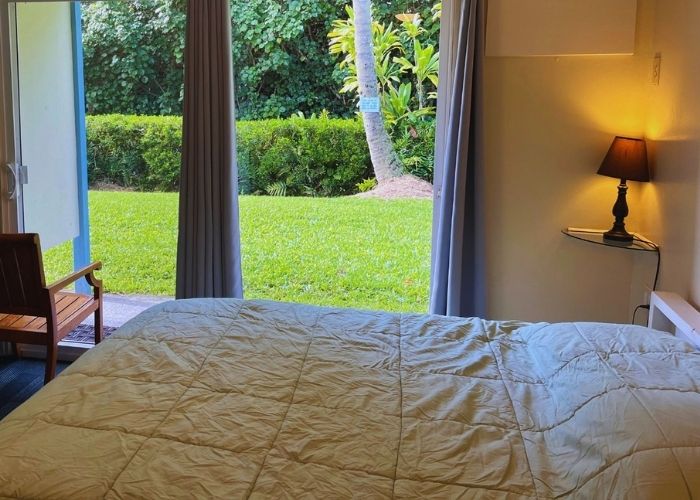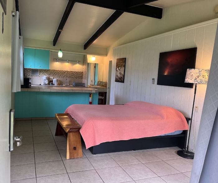 Our Studio is one of our most requested rooms, with a Queen-size bed, private bathroom, kitchenette, and air conditioning. The kitchenette features a mini fridge, a two-burner stove, a toaster, a microwave, and dishware. It’s perfect for guests who enjoy the open layout of a studio. Complimentary parking is right next to your room for easy luggage handling. This room is located in our 6-bedroom House, which is 200ft (60m) from the main Lodge in a vibrant tropical garden setting.