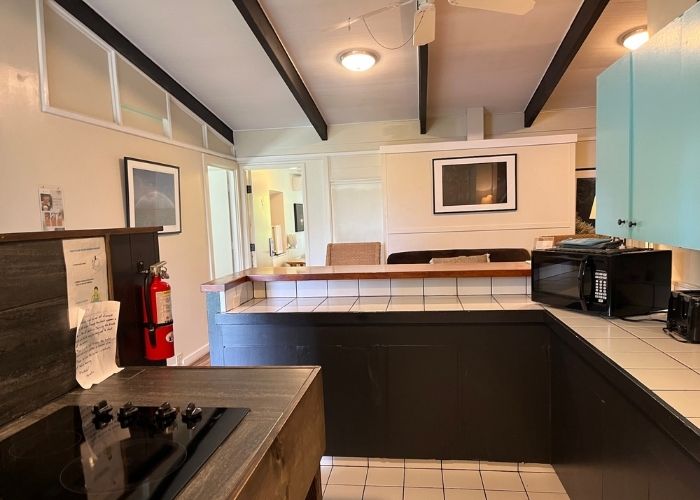 Kitchens are equipped with a two-burner stove, toaster, microwave, dishware—perfect for guests who prefer to prepare their own meals.